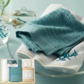 澄み渡るような色づくりと甘撚りのコーマ糸で織り上げた、ふんわり心地の泉州タオルと、「保湿の王様」と呼ばれるシアバターを配合した、心地良いミルクの香りとクリーミーな泡が魅力の石けんを、セットにしました。