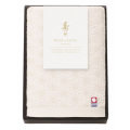 やさしい色合いに仕上げた今治タオルです。タオルの柄の「麻の葉模様」は伝統的な和柄の一種で、古くから麻はすくすくと真っ直ぐに伸びることから成長を願う縁起の良い柄とされています。