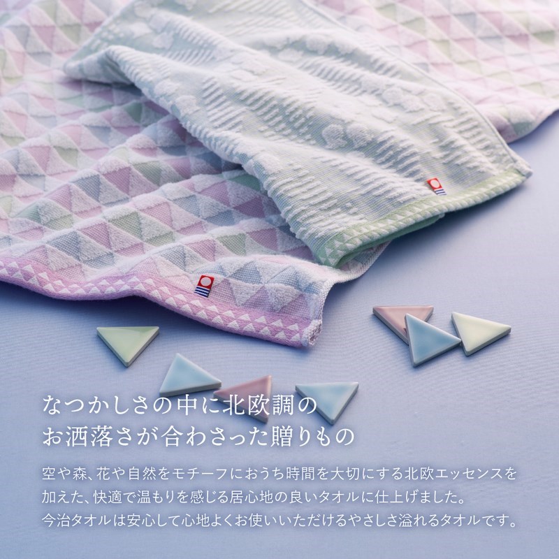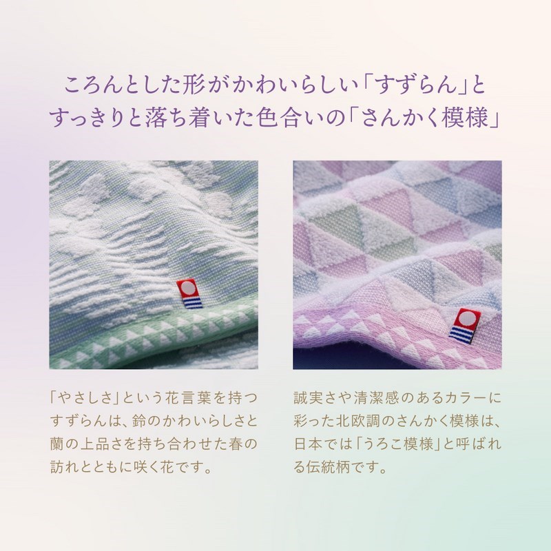 ころんとした形がかわいらしい「すずらん」と、色とりどりの「さんかく模様」の今治タオルです。
