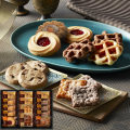 ブルーベリージャムをトッピングした甘酸っぱいロシアケーキやアーモンドをトッピングしたロシアケーキ、食感にアクセントをつけた、程よい甘さのプレーンワッフル、やわらかな生地に、カリカリとした食感がアクセントのチョコレート風味のチョコワッフル、パイ、クッキーなどを詰め合わせたこだわりのギフトです。
