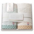 タオル産地として、日本一を誇る愛媛県今治市。伝統の技術で織り上げられたタオルは、使いはじめから吸水性がよく、ふんわりした風合いが長続きします。小紋柄をあしらったシンプルなデザインで、シーンを選ばず使いやすいタオルです。
