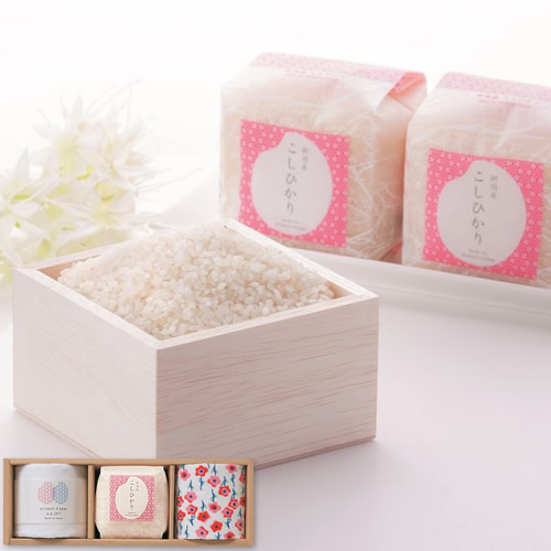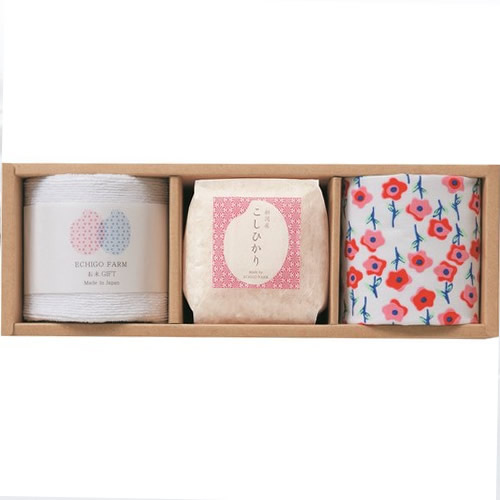 【内容】こしひかり(300g)、マイクロファイバークロス(25×25cm)、はんかち(34×28cm)
