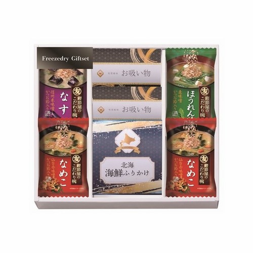【内容】フリーズドライ味噌汁(なす)(7.4g)×1、フリーズドライ味噌汁(なめこ)(5.9g)×2、フリーズドライ味噌汁(ほうれん草)(7.5g)×1、北海海鮮ふりかけ(3g×2)×1、松茸風味のお吸い物(2.3g×2)×2・日本製