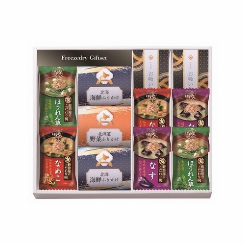 【内容】フリーズドライ味噌汁(なす)(7.4g)×2、フリーズドライ味噌汁(なめこ)(5.9g)×2、フリーズドライ味噌汁(ほうれん草)(7.5g)×2、北海海鮮ふりかけ(3g×2)×2、北海道野菜ふりかけ(3g×2)×1、松茸風味のお吸い物(2.3g×2)×2・日本製