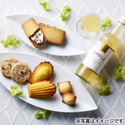 【内容】フルーツドリンク(アップル)180ml×1、ナッツとチョコのざっくりクッキー×3、プチフィナンシェ4個入(プレーン)×1、キャラメルレーズンサンド×2、マドレーヌ(プレーン)×2