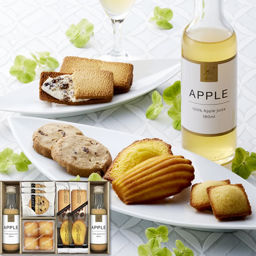 【内容】フルーツドリンク(アップル)180ml×2、ナッツとチョコのざっくりクッキー×3、プチフィナンシェ4個入(プレーン)×1、キャラメルレーズンサンド×2、マドレーヌ(プレーン)×2