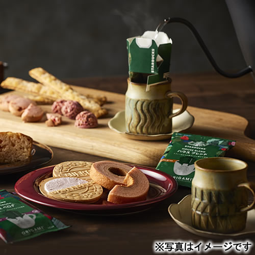 【内容】スターバックスオリガミドリップコーヒー(ハウスブレンド9g×3・カフェベロナ9g×2)、あまおう苺ロングスティックパイ×2、あまおう苺バウムクーヘン×2、あまおう苺ゴーフレット×1、焼きほろろイチゴクッキー×2、ストロベリーチョコクランチ×2